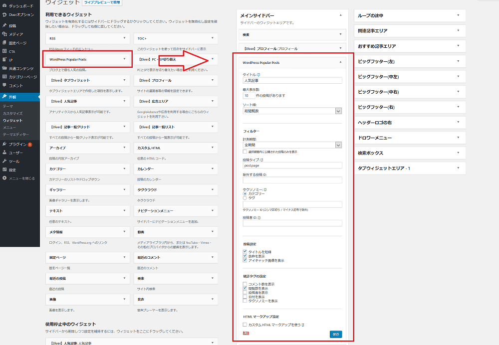 - 利用できるウィジェットから「WordPress Popular Posts」をメインサイドバーにドラック移動